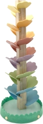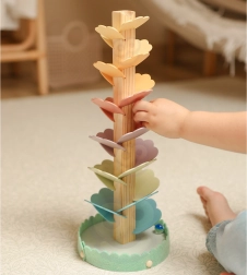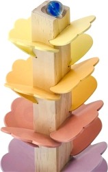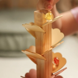 De houten muzikale boom, ook wel knikkerboom genoemd, verandert elke rit van een knikker in een rustgevend concert. De bonte “blaadjes” vormen het parcours waarlangs de knikkers naar beneden rollen en bij elke aanraking prettige, zachte tonen laten horen. Het speelgoed bevordert concentratie, geduld en natuurlijke nieuwsgierigheid.
