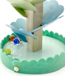 Elke aanraking van de knikker op een kleurrijk “blaadje” creëert een zachte klank die aan een cimbaal doet denken. Kinderen verbinden zo visuele prikkels met muziek en ontwikkelen hun zintuiglijke waarneming.