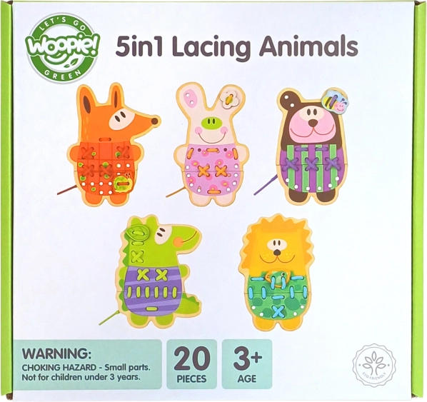Houten rijgdiertjes 5-in-1 van het merk Woopie Green bieden een geweldige combinatie van plezier en educatie voor kinderen. Deze kleurrijke, houten diertjes met rijggaatjes stimuleren de ontwikkeling van de fijne motoriek en de oog-handcoördinatie.