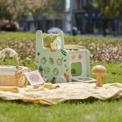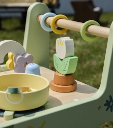 Het houten keukentje groeit met je kind mee, van loopwagen tot speelkeuken, en ondersteunt de ontwikkeling.