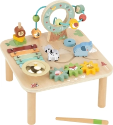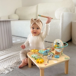 Ontdek een kwalitatief houten activity-tafeltje dat kinderen op een natuurlijke manier aanzet tot ontdekken. Dankzij de verschillende speelzones – van de xylofoon en tandwielen tot het kralenlabyrint – trainen kinderen hun coördinatie, precisie van beweging en begrip van oorzaak en gevolg. De stevige houten constructie en de zachte pastelkleuren passen perfect in de kinderkamer.