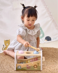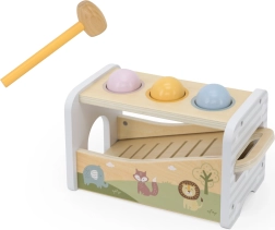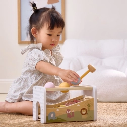 Dit veelzijdige houten speelgoed combineert een hamerbank en een xylofoon in één slim geheel. Het kind kan met het hamertje op de gekleurde balletjes tikken, die over de metalen toetsen rollen en aangename tonen laten klinken, of het stokje pakken en eigen melodieën creëren.