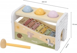 De combinatie van een hamerbank en xylofoon zorgt voor dubbele dosis spel en melodieën – sla op de balletjes of speel met het stokje op de toetsen.