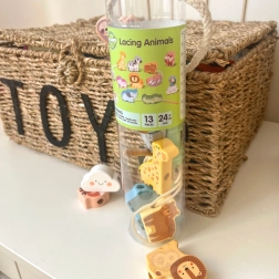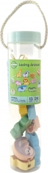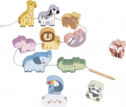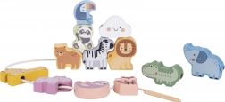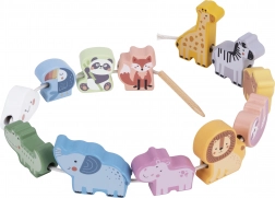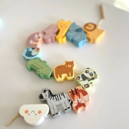 Het rijgen van houten diertjes aan het koord traint op natuurlijke wijze de greep, oog-handcoördinatie en precisie van bewegingen – ideale voorbereiding op tekenen en schrijven.