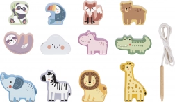 Deze schattige set bevat 11 kleurrijke houten diertjes en een vrolijk wolkje die kinderen eenvoudig kunnen rijgen aan het bijgeleverde koord met houten punt. Elk onderdeel heeft preciese rijggaten die geduld en concentratie bevorderen. Pasteltinten en een aantrekkelijk design prikkelen de fantasie en maken van leren een natuurlijk onderdeel van het spel.
