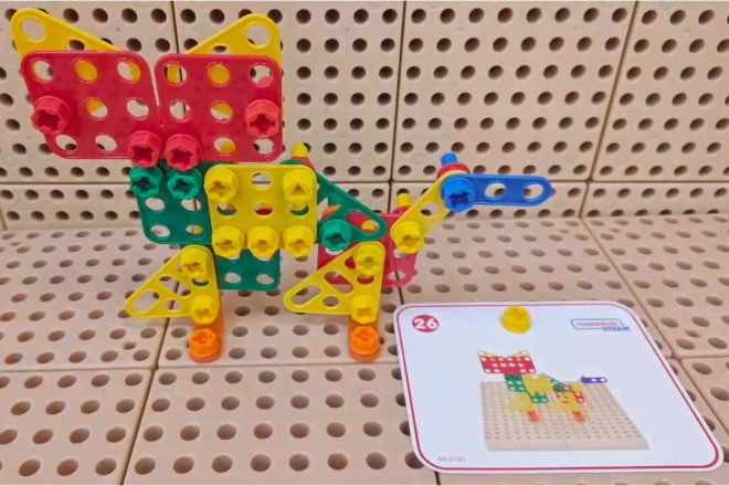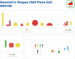 Deze complete set bevat vierkanten, driehoeken, cirkels, halve cirkels en platte strips in meerdere kleuren, die dankzij de openingen eenvoudig met schroeven aan Masterkidz-panelen, tafels of wagens kunnen worden bevestigd. Kinderen kunnen patronen, bloemen en complexere constructies maken en daarbij plannen, onderdelen kiezen en details afwerken oefenen.