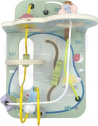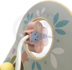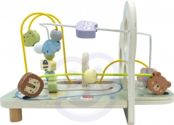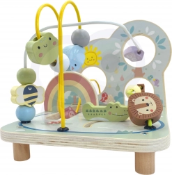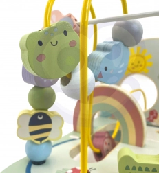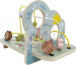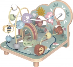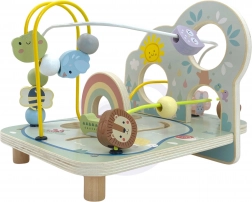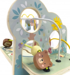 Het bos-kralenlabyrint van massief hout valt op door de hoogwaardige afwerking, pastelkleurige tinten en lieve illustraties van dieren, een regenboog en een zonnetje. Kinderen schuiven kralen en vormen over drie kronkelende banen, trainen de precisie van hun vingerbewegingen en concentratie en beleven plezier aan het voltooien van de route.