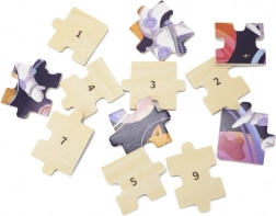 De houten VIGA-puzzel Kosmisch avontuur valt op door heldere kleuren en duidelijk genummerde stukjes die kinderen helpen stap voor stap te leggen zonder onnodige frustratie. De stevige houten ondergrond fungeert als frame en als visueel voorbeeld – zo ziet het kind eenvoudig waar elk stukje hoort.