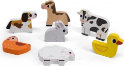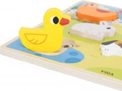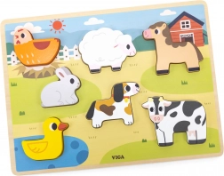 De set bevat 7 schattige dieren – kip, schaap, paard, konijntje, eendje, hond en koe. Door de grotere dikte van de stukken zijn ze makkelijk vast te pakken en kunnen kinderen ze ook buiten het bord gebruiken als losse figuren voor fantasierijk spel.