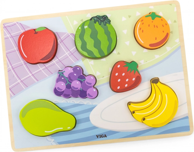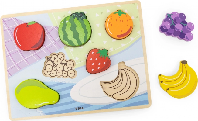 Ontdek speels leren met de houten fruitpuzzel van Viga. De set bevat een stevige, kleurrijk geïllustreerde bodemplaat en 7 stukken (appel, meloen, sinaasappel, druiven, aardbei, bananen en peer) die kinderen in de overeenkomstige vormen plaatsen. Heldere kleuren en duidelijke omtrekken ondersteunen het herkennen van vormen en kleuren.