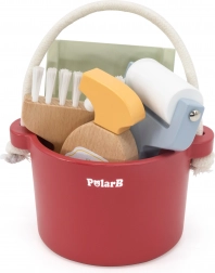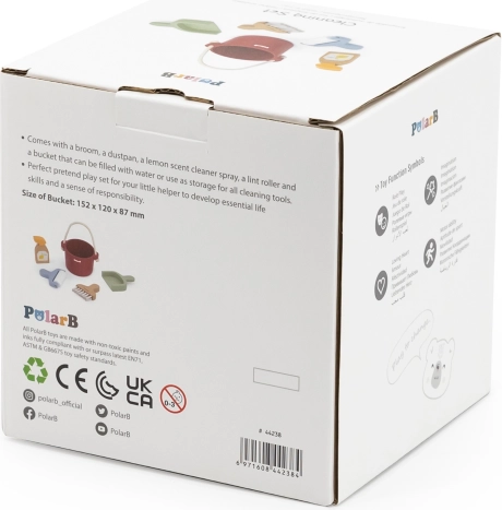 Geef kinderen plezier in imitatiespel met de houten schoonmaakset POLARB. De emmer met een duurzaam touwhandvat fungeert ook als slimme plek voor het makkelijk opbergen van alle tools. De houten onderdelen liggen prettig in de hand, zijn duurzaam en visueel aantrekkelijk dankzij de zachte pasteltinten.