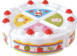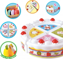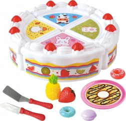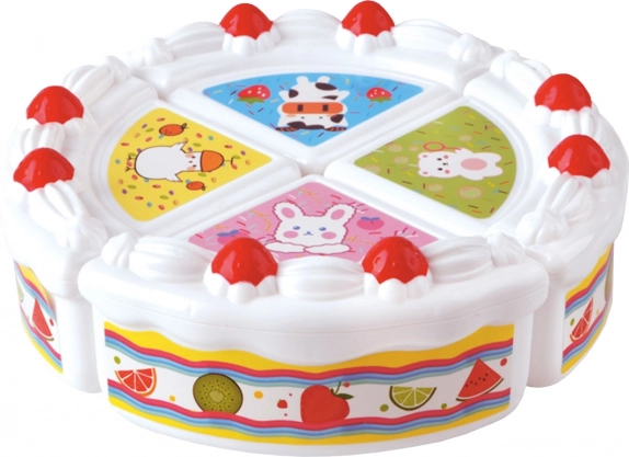 De ronde taart kan in stukjes worden verdeeld en geserveerd met een mes, spatel en bordje – perfect om de fijne motoriek en het samen delen te oefenen.
