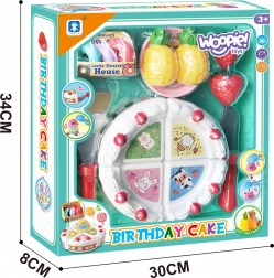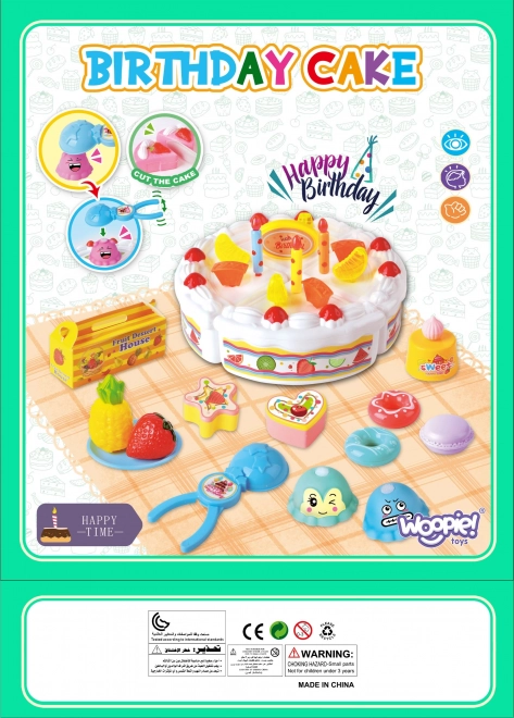 De schattige verjaardagsset van het merk Woopie verandert elk kinder-theemoment in een onvergetelijk feest. De mooi versierde kunststof snijtaart kan eenvoudig in porties worden verdeeld en dankzij accessoires zoals een mesje, spatel en bordje kunnen kinderen serveren als echte gastheer of gastvrouw.