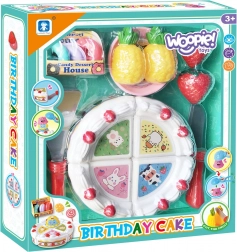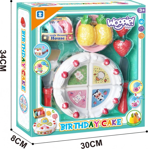De Woopie kinderset met taart, fruit en zoetigheden om te snijden biedt urenlang creatief spel. Kinderen kunnen een verjaardagsfeest organiseren, de snijtaart in stukken verdelen en serveren met behulp van de accessoires. Stimuleert de fijne motoriek en rollenspel vanaf 3 jaar.