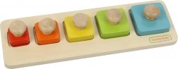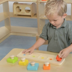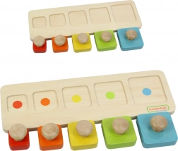 Houten educatief speelgoed geïnspireerd op de Montessori-methode, ideaal voor de ontwikkeling van fijne motoriek, sensorische vaardigheden en hand-oogcoördinatie bij kinderen. Het bestaat uit vijf vierkante blokken in verschillende kleuren en maten, die het kind plaatst in de overeenkomstige posities op een dubbelzijdige basis: de ene zijde bevat gekleurde stippen voor gemakkelijker matchen, de andere zijde alleen uitsparingen voor meer uitdaging.