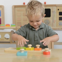 De houten blokken en de uitsparingen stimuleren precisiewerk van handen en ogen, wat kinderen oefenen bij het plaatsen van de onderdelen.