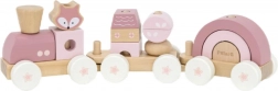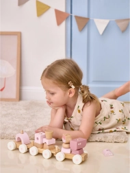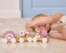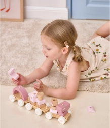 Schattig roze houten treintje uit de PolarB-lijn van Viga waar elk kind blij van wordt. Bestaat uit 3 wagonnetjes en 14 blokken in verschillende vormen die vrij te combineren en stapelen zijn. Dankzij de zachte pastelkleuren, het veilige houten ontwerp en de prettige vormen is het ideaal voor het ontwikkelen van fijne motoriek, coördinatie en creativiteit vanaf 18 maanden.