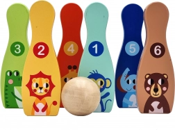 De houten bowlingset met zes kleurrijke kegels en een bal is een ideale spelactiviteit voor de kinderkamer. Elke kegel heeft een dierenmotief en nummering 1–6, waardoor kinderen tijdens het spelen op natuurlijke wijze leren tellen, kleuren herkennen en motorische vaardigheden ontwikkelen.
