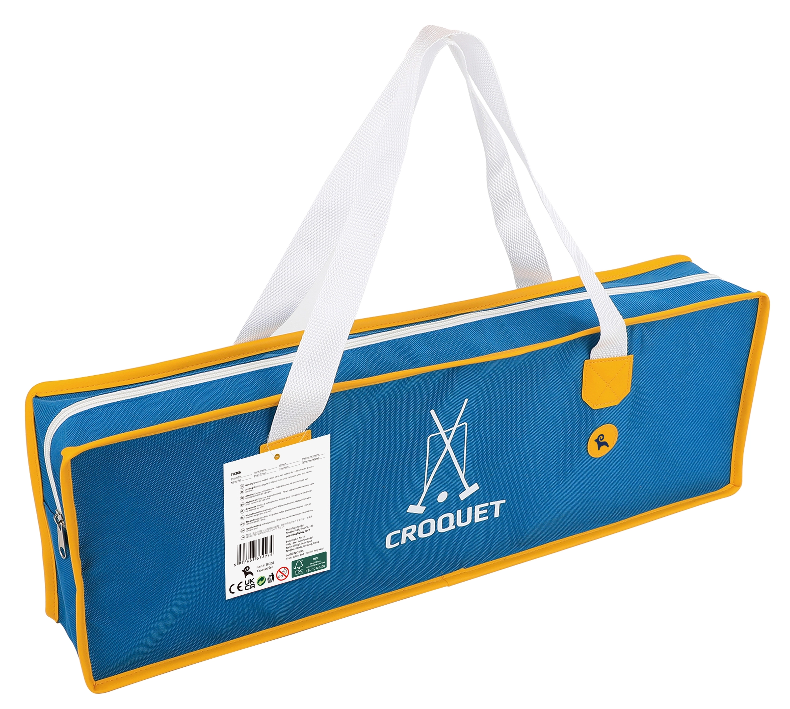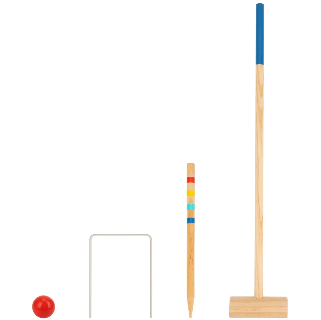 In de verpakking vind je 4 houten hamers, 4 gekleurde ballen, 6 metalen poortjes, 4 eindpaaltjes en een tas – alles klaar voor direct spel.