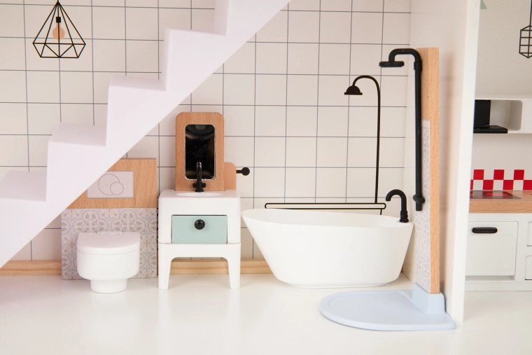 Ontdek de charme van moderne architectuur in kindervorm. Het houten poppenhuis van TOOKY TOY heeft 3 niveaus vol details – een keuken met eetkamer en een badkamer op de begane grond, een ruime woonkamer op de eerste verdieping en een knusse slaapkamer met balkon op zolder. Inclusief meubels en decoraties die elke kamer een realistische sfeer geven.