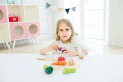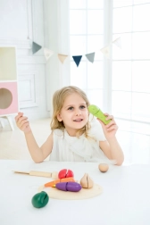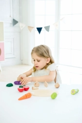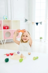 Spelen met etenswaren ondersteunt de ontwikkeling van fijne motoriek, oog-handcoördinatie, creativiteit en herkenning van kleuren en vormen. Natuurlijke materialen en zorgvuldige afwerking garanderen een lange levensduur en veiligheid bij dagelijks spel.