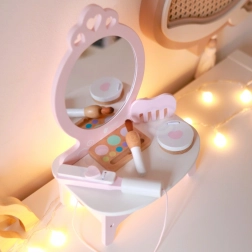 Deze prachtige kinderkaptafel in roze is voorzien van een spiegel en 11 verschillende accessoires, waaronder een kam, lippenstift, stijltang voor het haar, poederdoosje en meer. Alle accessoires zijn gemaakt van kwalitatief hout, en het ontwerp in pastelkleuren geeft het speelgoed een magische uitstraling. De kaptafel biedt voldoende opbergruimte voor alle geheime cosmetische trucjes van je kleine model.