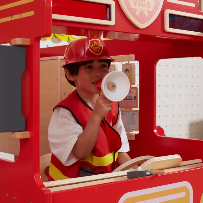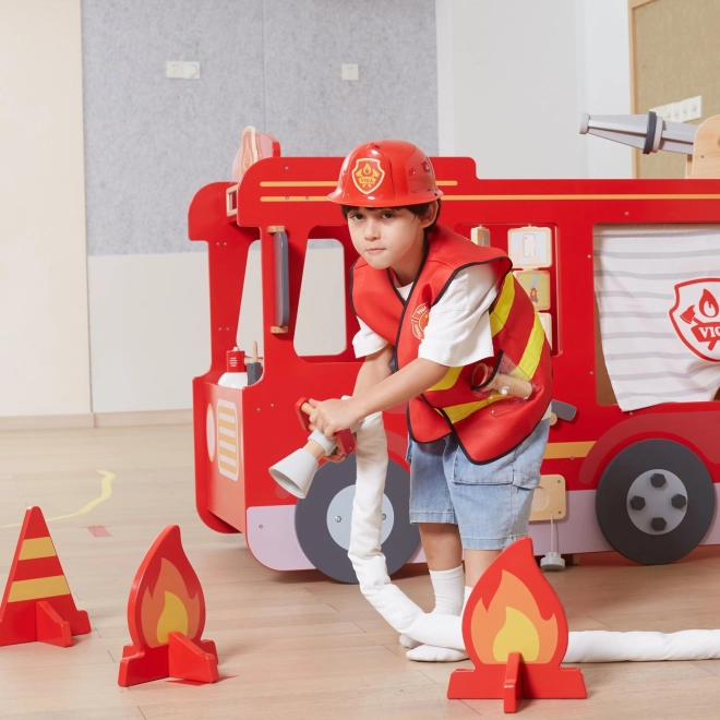 De brandweerset voor kinderen van het merk VIGA is het ideale cadeau voor kleine fans van het brandweervak. De set bevat een rode en gele bodywarmer, een rode helm, een megafoon, twee zwarte walkietalkies en een rode zaklamp, perfect voor creatief spel.