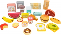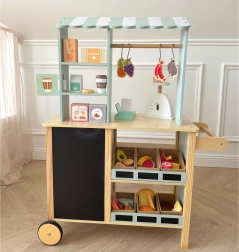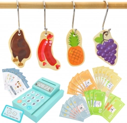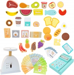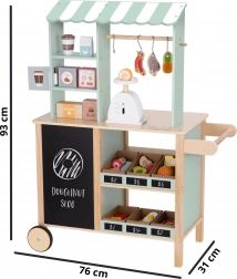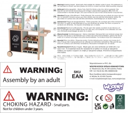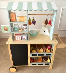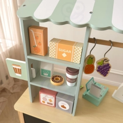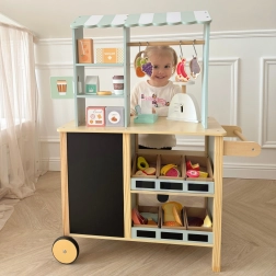 Houten winkel WOOPIE GREEN is het ideale speelgoed voor kinderen die sociale, wiskundige en organisatorische vaardigheden leren door rollenspellen. Het bevat 73 elementen, inclusief een weegschaal, levensmiddelen, een kaartlezer en een krijtbord voor aantekeningen. Dit alles is gemaakt van veilig hout en geverfd met niet-giftige verven.