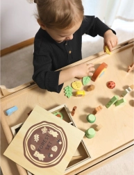 Set wordt geleverd in een houten doos met inklapbaar deksel dat dienst doet als krijtbord.