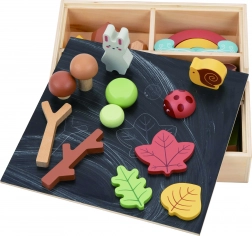 De set wordt bewaard in een praktische houten doos, waarvan de achterkant van het deksel is ontworpen als een krijtbord.
