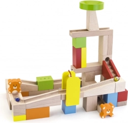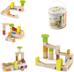 Bouw je eigen avontuurlijke knikkerbaan van 49 stevige houten onderdelen en kijk hoe de glazen knikkers over de banen en hellingen zoeven. De set biedt creatief bouwen, leren over oorzaak en gevolg en ontwikkeling van motorische vaardigheden. De praktische emmer met handvat zorgt voor eenvoudig opbergen en meenemen. Gekleurde, gladde onderdelen van veilig gelakt hout en speelse elementen (trapjes, beertjes) maken elk kind blij.