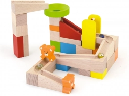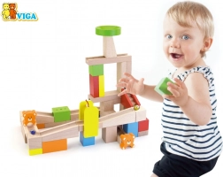 Deze houten knikkerbaan van het merk VIGA biedt kinderen uren speelplezier én leermomenten. Met diverse blokken, hellingen, pilaren en een trechter bouw je moeiteloos talloze banen waarover de knikkers soepel rollen. De set bevat ook decoratieve en speelse elementen, zoals trapjes en beertjes, die je bouwwerken karakter geven en het vertellen van verhalen stimuleren.