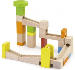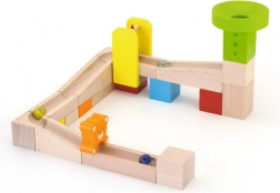 De set bevat hellingen, pilaren, blokken en speciale elementen waarmee je zowel eenvoudige als uitgewerkte knikkerbanen bouwt.