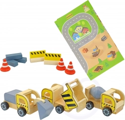 - 3 bouwvoertuigen: kiepwagen, mixer, graafmachine