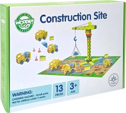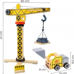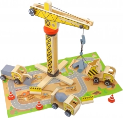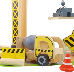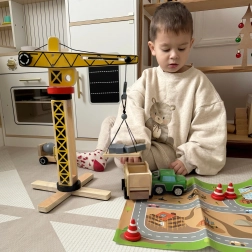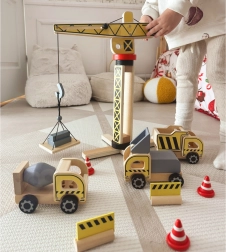 De uitgebreide bouwset van het merk WOOPIE GREEN is bedoeld voor kleine bouwers. Deze set bevat een grote houten kraan, drie bouwvoertuigen en andere accessoires voor realistische bouwspelen.