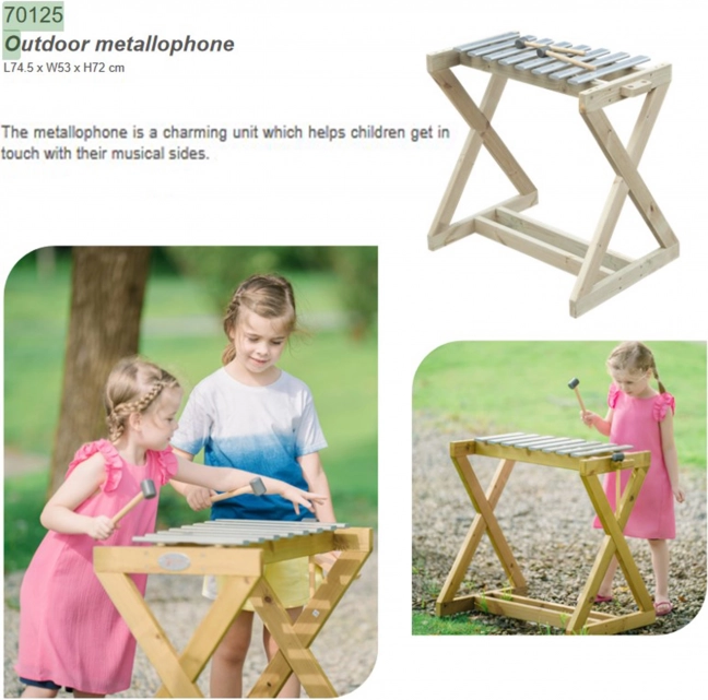 Ontdek de vreugde van muziek in de buitenlucht. Het robuuste houten frame en de metalen toetsen garanderen een zuivere, resonerende toon en een lange levensduur, zelfs bij frequent buitengebruik. De melodofoon is ideaal voor kleuterscholen, speelplaatsen en thuistuinen – kinderen oefenen hun coördinatie, gehoor en ritme, en versterken tegelijk hun zelfvertrouwen en durf om met een eigen melodie naar voren te treden.