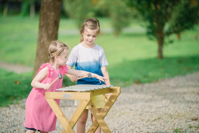 Het instrument is gemaakt van kwaliteits hout uit verantwoorde bronnen en ontworpen om regen en zon te weerstaan. Dankzij de twee stokjes kunnen ook twee kinderen tegelijk spelen en samen de magie van muzikaal samenspel ontdekken.