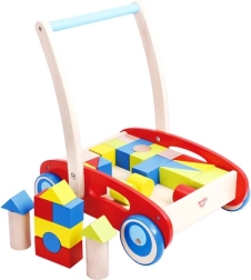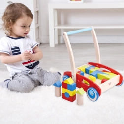 Het houten duwwagentje met 23 blokken is de ideale hulp bij de eerste stapjes. Dankzij het goed geplaatste handvat en de stevige wieltjes staat het kind stabieler en leert het in een veilig tempo lopen. De set met gekleurde blokken biedt bovendien uren creatief speelplezier – bouwen, vervoeren en kleuren sorteren.