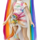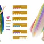 De pop heeft uitzonderlijk lang, soepel haar met gekleurde lokken die je gemakkelijk kunt borstelen, vlechten en stylen in verschillende looks – van golven en vlechtjes tot opvallende gekleurde lijnen.