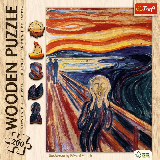 Ontdek de unieke houten puzzel van TREFL met het iconische werk EDVARD MUNCH – De Schreeuw. De hoogwaardige lasersnede zorgt voor gladde randen en nauwkeurig passende stukjes. De puzzel is dubbelzijdig – aan de ene kant het kunstwerk, aan de andere kant een decoratief patroon dat je vrij kunt inkleuren om zo je eigen kunstwerk te creëren. De ecologische verpakking is volledig plasticvrij.