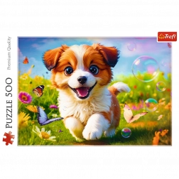 Puzzel Vrolijke hond bestaat uit 500 stukjes en toont een schattige hond. De voltooide puzzel heeft afmetingen van 480x340 mm.