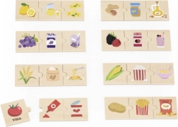 Elk paar stukjes verbindt een gewas met het eindproduct (bijv. citroen → limonade, maïs → popcorn). Kinderen leren spelenderwijs verbanden en ontwikkelen logica.
