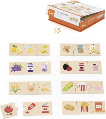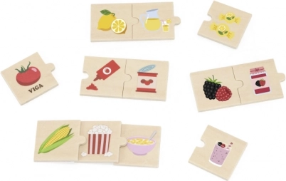 Deze kwalitatieve houten set bevat eenvoudige puzzels die de grondstof koppelen aan het bewerkte product. Kinderen leren op een speelse manier waar hun favoriete lekkernijen vandaan komen – bijvoorbeeld aardappel en frieten, citroen en limonade, maïs en popcorn of druiven en druivenjam/sap.
