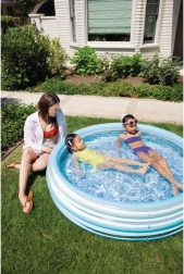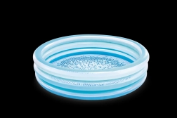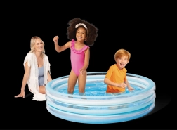 Het blauwe opblaasbare kinderzwembad zorgt voor aangename verfrissing tijdens warme dagen. De stabiele constructie met drie opblaasbare ringen garandeert stevigheid en zachte randen, terwijl de bodem van verzacht PVC prettig aanvoelt en uitglijden beperkt.