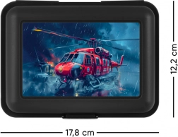 Het deksel met een illustratie van een rode helikopter geeft de broodtrommel een interessant uiterlijk, ideaal voor kinderen.