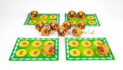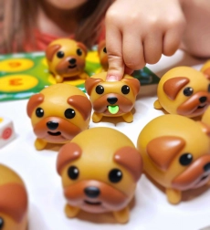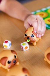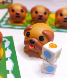 De dobbelstenen met gekleurde lolly's bepalen welke mopshonden je moet vinden, wat dynamiek en strategie aan het spel toevoegt.