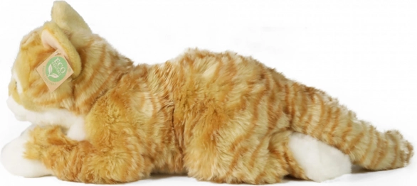 De pluchen kat heeft details die een echte kat natuurgetrouw nabootsen, inclusief blauwe ogen en een helder oranje vachtkleur.