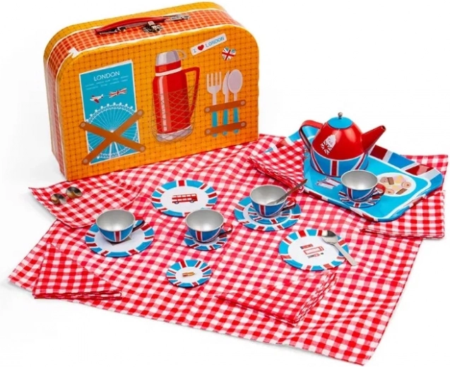 Deze theeset met Londen-motieven laat je kinderen de perfecte five o'clock tea creëren. Het koffertje bevat alles wat nodig is voor een klein theepicknickje: