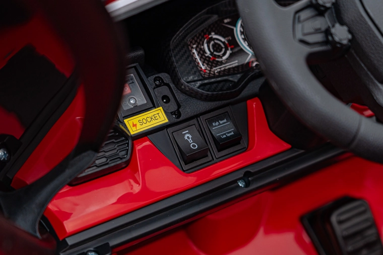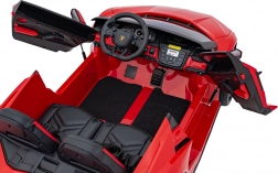 Het interieur verrast met een dubbele stoel van eco-leer met veiligheidsgordels, een realistisch stuur, pedalen en een overzichtelijk bedieningspaneel. Kinderen zullen dol zijn op de audiofuncties – FM-radio, MP3, USB, AUX en Bluetooth, inclusief voorgeprogrammeerde melodieën en claxon. Openende schaardeuren en volledig functionele LED-verlichting accentueren de premium uitstraling.