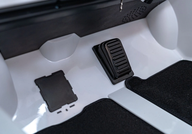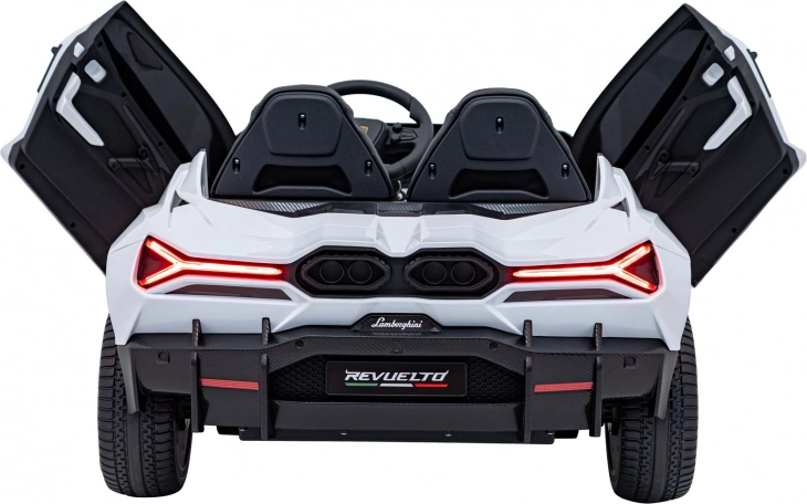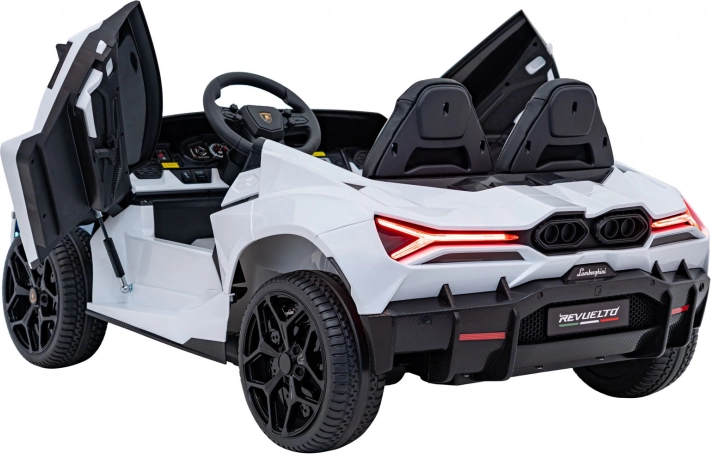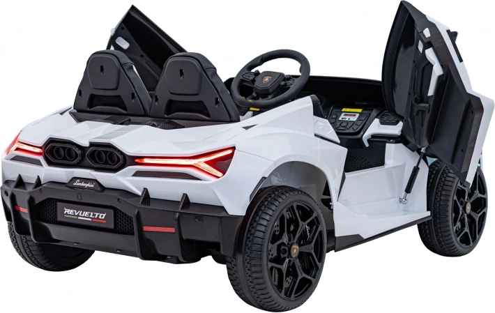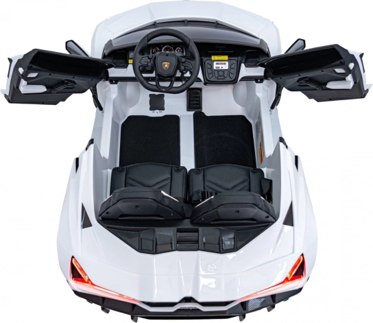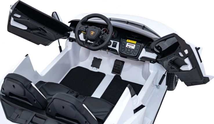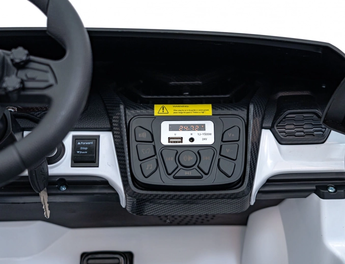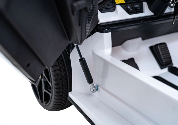 Ouders waarderen de 2,4 GHz afstandsbediening met 3 snelheden en de nood-Stopknop. Kinderen vermaken zich met het multimediapaneel met FM-radio, Bluetooth, USB, MP3 en AUX-ingang. De dubbele stoel van eco-leer met veiligheidsgordels biedt comfort aan twee bestuurders, de praktische laadindicator houdt de accustatus in de gaten en de opklapbare scissor-deuren maken de beleving compleet.